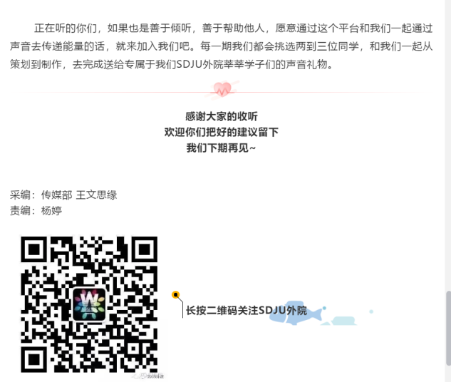复课复学话题只是“Let’s Talk”电台的一个开始,陪伴大家的使命才刚刚启程,“Let’s Talk”这一档互动类栏目旨在于倾听每一位学生的心声,包容每一份情绪的表达,保护每一种烦恼的脆弱。栏目通过邮箱sdju_wydt@163.com开放投稿,也希望利用这样的方式,借助同学之间的互帮互助和新媒体媒介的私密、新颖,为更多的同学解决心理压力和生活烦恼。(杨婷 金嘉懿)