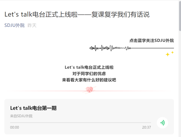 为迎合新媒体时代,并通过更为新颖的形式增加学生思政工作和心理教育的趣味性和有效性,外国语学院在“SDJU外院”微信公众平台上推出首档互动类栏目“Let’s Talk”。5月20日,本栏目推出第一期节目,针对“即将复课复学,我们要做什么”的话题展开了讨论和分享。