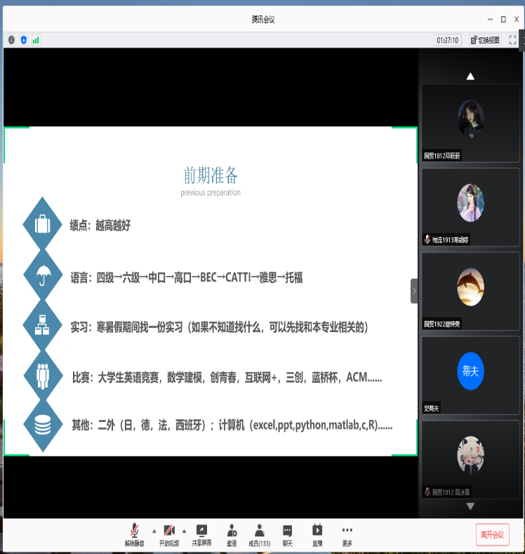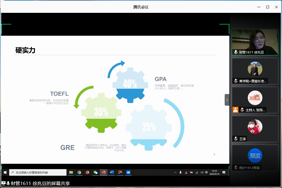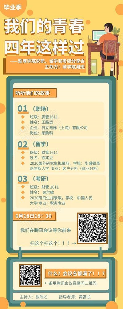 为缓解在校生线上在家学习的焦虑,更好地指导同学们积极应对大学时光,帮助学生们主动加强对未来的理性规划,上海电机学院商学院易班工作站特别邀请了2020届在求职、留学和考研的优秀毕业生代表进行经验分享。由于疫情原因,故本次“我们的青春四年这样过—暨商学院毕业生求职、留学和考研分享会”于2020年6月18日18:30在腾讯会议上召开,由易班站长张陈芯主持此次会议,辅导员黄富长老师作为指导老师,并邀请了商学院学生工作办公室主任陈庄瑜老师做致辞和总结发言。