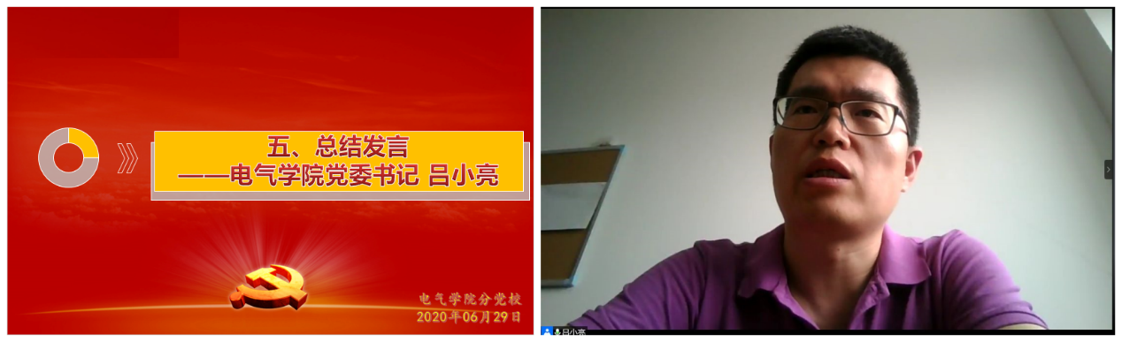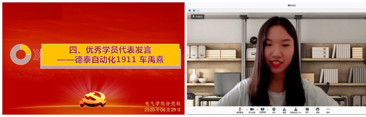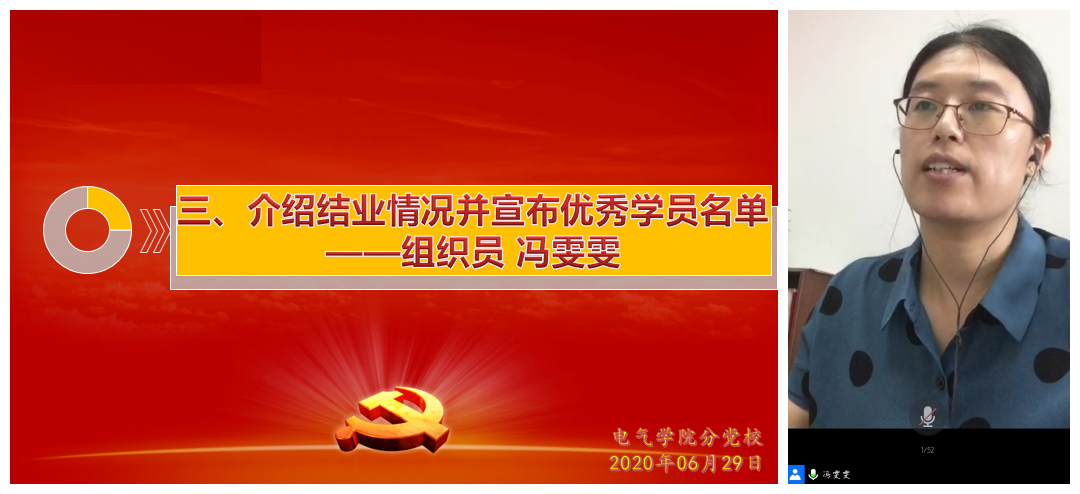 6月29日中午,电气学院在腾讯会议举行了第38期业余党校线上结业典礼。电气学院党委书记、学院分党校校长吕小亮、学院专职组织员冯雯雯、学生党支部书记和本期业余党校全体学员参加结业仪式。结业典礼由学院团总支学生会党团建设部部长朱婷婷主持。