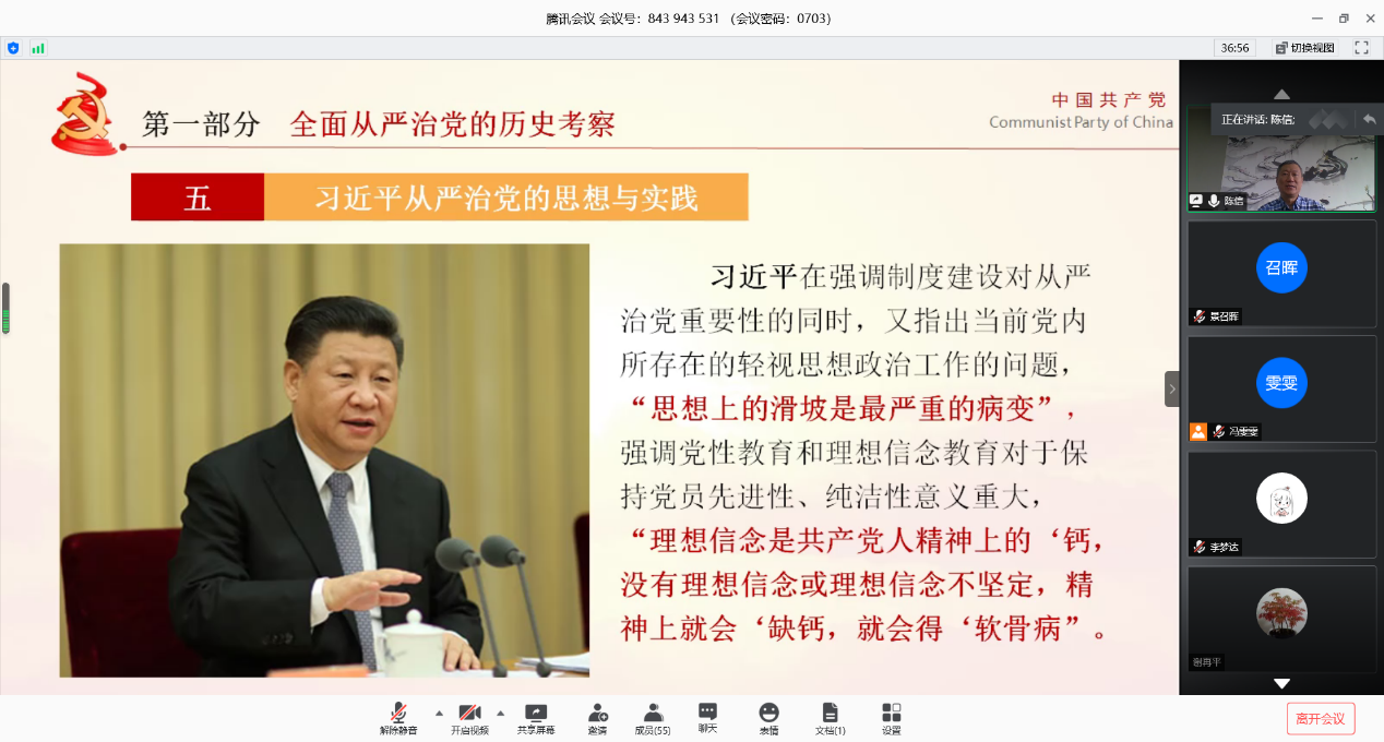 为深入贯彻落实学校党委关于“四史”学习教育的部署,把开展“四史”学习教育作为筑牢不忘初心、牢记使命思想根基的重要举措,7月3日下午1点,学校党委副书记、纪委书记陈信在电气楼401为通过线上线下结合的方式为电气学院师生党员生动地上了一堂“中国共产党全面从严治党的历史考察与基本经验”的专题党课。电气学院党委委员、党支部书记、师生党员代表以及来自其他二级党组织的纪检委员现场参加,60名师生党员通过腾讯视频聆听了本次党课。