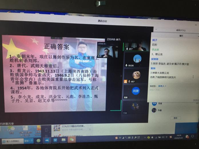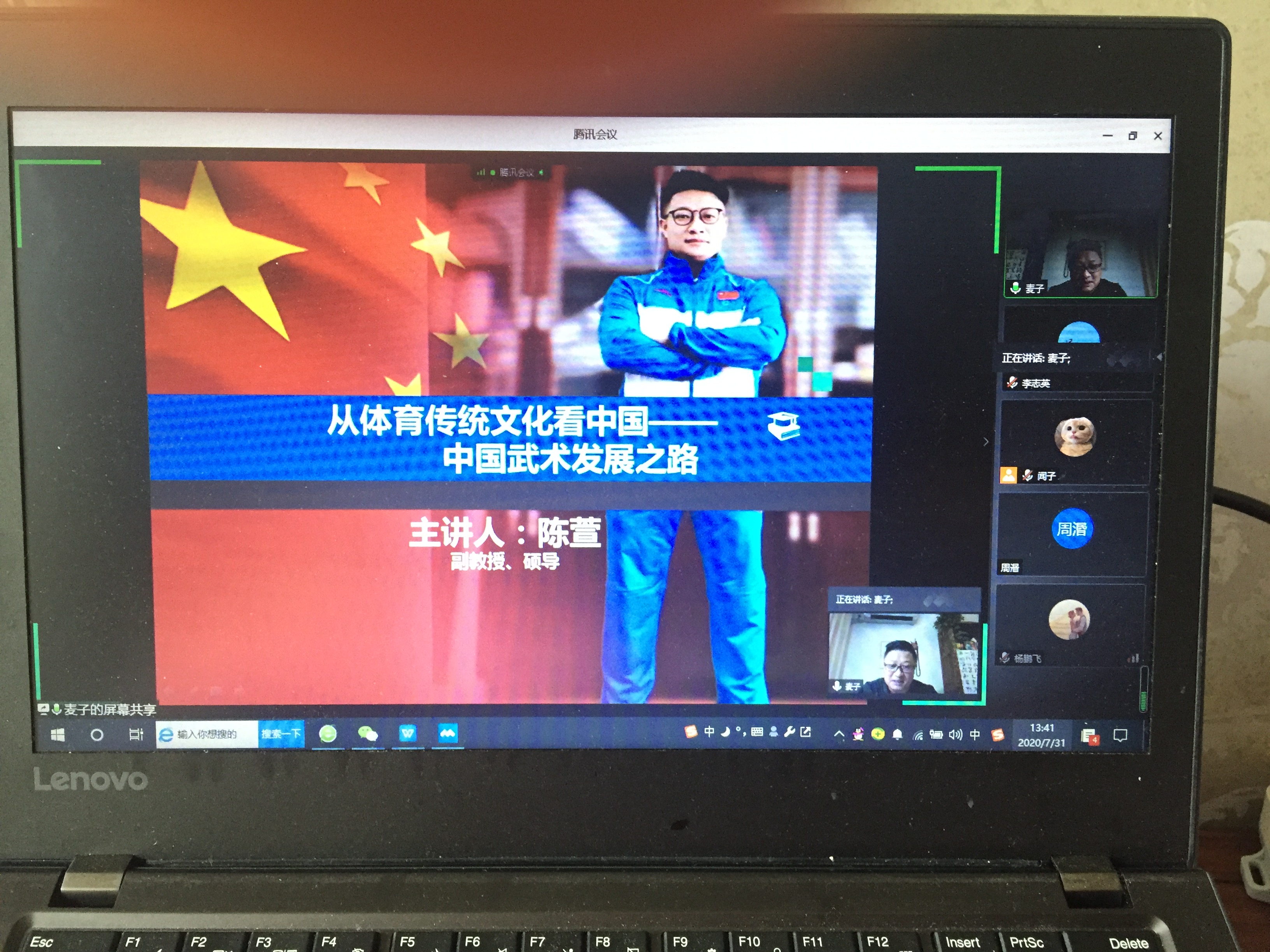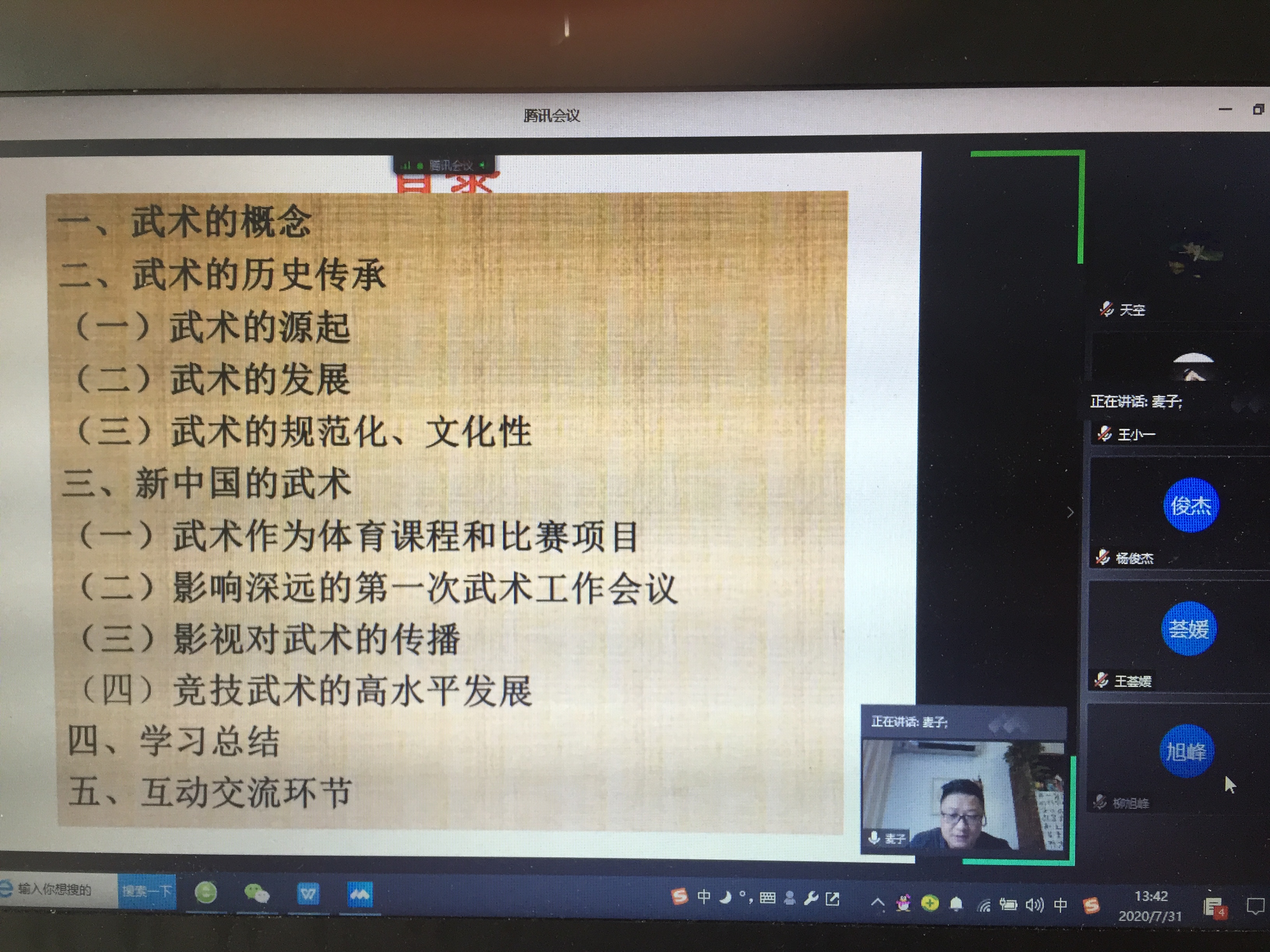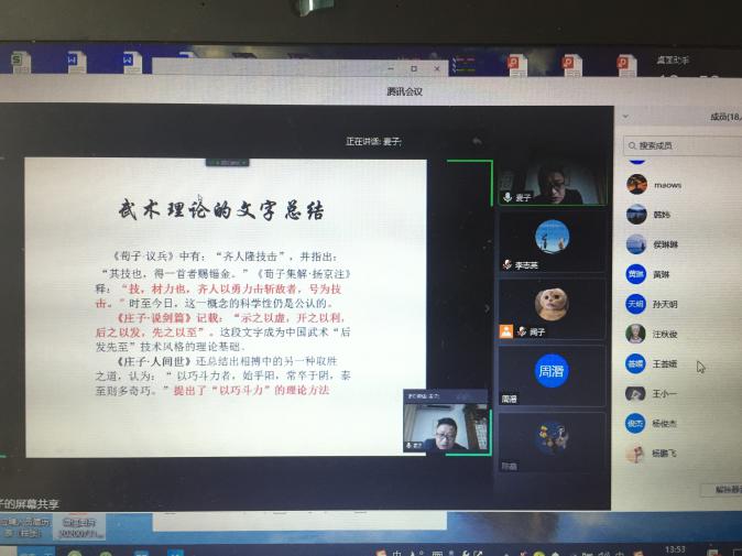 主讲人——体育教学部副主任陈萱副教授,从自己日常研究累积的角度,专业体育老师的视角,用丰富的图片、史实资料诠释了中国武术的概念、源起、发展、武术的规范化文化性、新中国的武术等几个方面。通过专题学习,同志们进一步加深了对中国武术在文化层面的理解。中国武术不仅涵盖了西方体育的多种运动形式,而且,还拥有独特的东方传统运动形式、深邃的思想和厚重的文化。同志们还在线参加了互动交流探讨。
