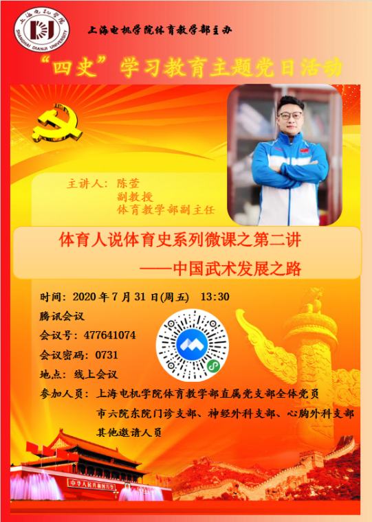 看《少林寺》《武当》《霍元甲》等武电影时,为何能强烈感受到主人公的精、气、神?我们中国武术有着如何悠久的历史?为什么说它是中华人民的优秀文化遗产之一?中国武术发展之路给我们带来哪些启示?带着这些问题,2020年7月31日下午,体育教学部直属党支部组织开展了一次线上“四史”学习主题党日活动暨“体育人说体育史”系列微课第二讲《中国武术发展之路》。全体党员同志,联系体育教学部的副校长杨俊杰,六院东院的门诊、神经外科、心胸外科的3个共建支部的书记及党员代表及部分受邀党外干部、群众也参加了线上学习。