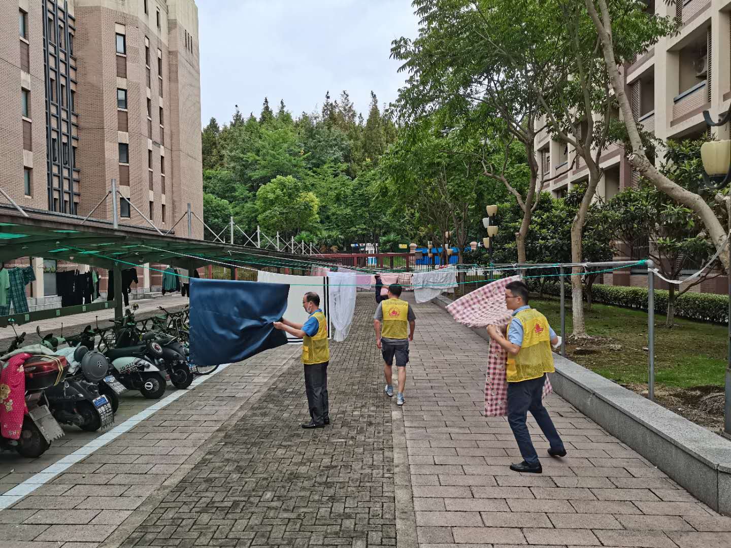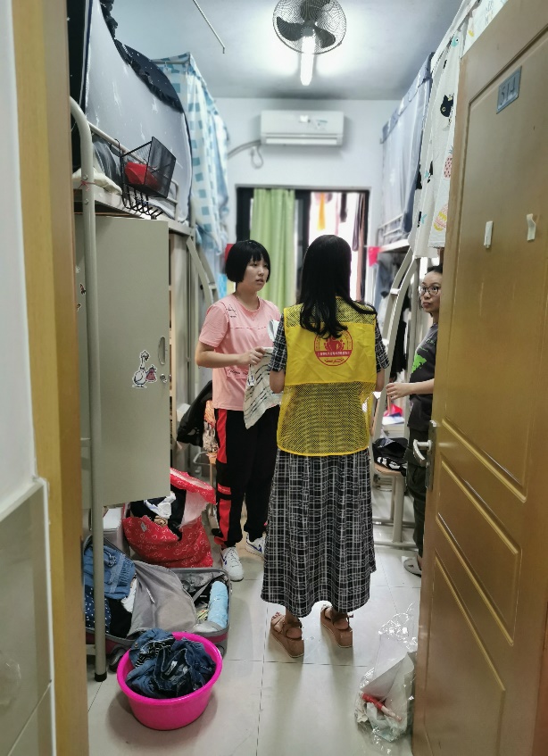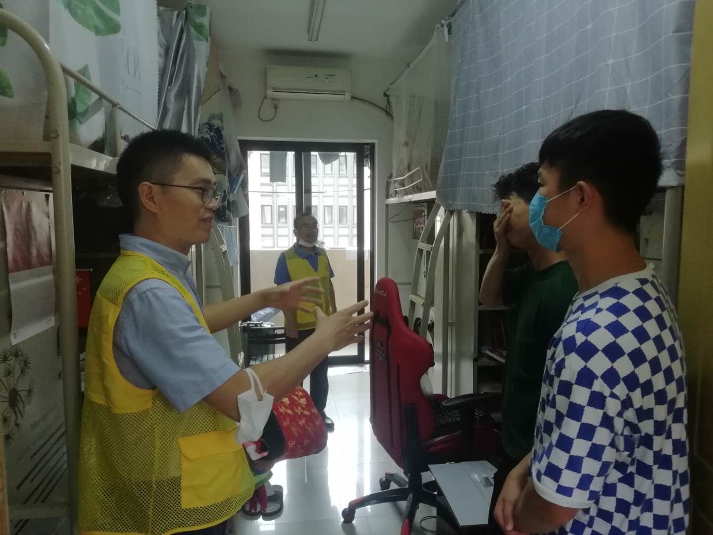 随后志愿者队伍来到生活园区,当时宿舍楼下面还晾晒着学生的棉被、床单,刹那间天空下起了雨,教师志愿者们火速将在晾晒的棉被等收到宿舍阿姨处。在学生寝室,教师志愿者们与返校学生亲切交流,亲切询问同学疫情期间的学习情况、返校方式、旅途情况、寝室衣物棉被状况、学校午餐情况、返校后的诉求,同时督促其在就餐、出行等各方面做好个人防护。
