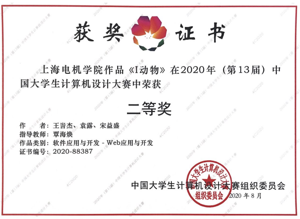 “中国大学生计算机设计大赛”是我国最早面向本科大学生的赛事之一,国内本科院校以及原985、211院校均曾组队参赛。该项赛事是全国A类赛事,入选全国普通高校学科竞赛排行榜。王訔杰、袁露、宋益盛同学在覃海焕老师指导下,作品《I动物》荣获上海市大学生计算机应用能力大赛一等奖,经上海赛区推荐参加2020年中国大学生计算机设计大赛决赛,获国赛二等奖;计算机科学与技术专业的陈作栋、连胜群和杨丽君3名同学,在范光宇老师和饶蕾老师的指导下,历经国赛初评、国赛复评和线上答辩三轮评审,获得中国大学生计算机设计大赛国赛三等奖。面向疫情期间公共场所口罩佩戴的应用需求,蔡骋老师指导学生张傲祥的“佩戴口罩检测FMDK”作品,获上海市大学生计算机应用能力大赛三等奖。
