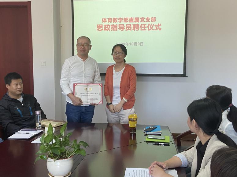 第三讲微课开始前,体育教学部直属党支部还进行了简短的思政指导员聘任仪式。李志英书记为担任体育教学部思政指导员、我校马克思主义学院副教授赵冰老师颁发了聘书,并代表体育教学部直属党支部感谢赵老师受聘,期待赵老师在宣传新思想、课程思政建设和研究生思政工作方面,给予体育教学部更多的指导和帮助。赵老师也表示受聘体育教学部思政指导员,将不负学校党委的信任,会在相关工作方面与体育教学部老师们一起努力挖掘公共体育课、专项课的思政元素,作出“以体育人”的课程思政特色。(王琤)