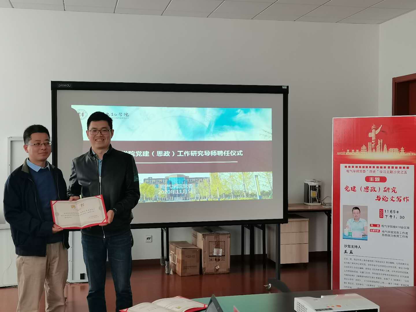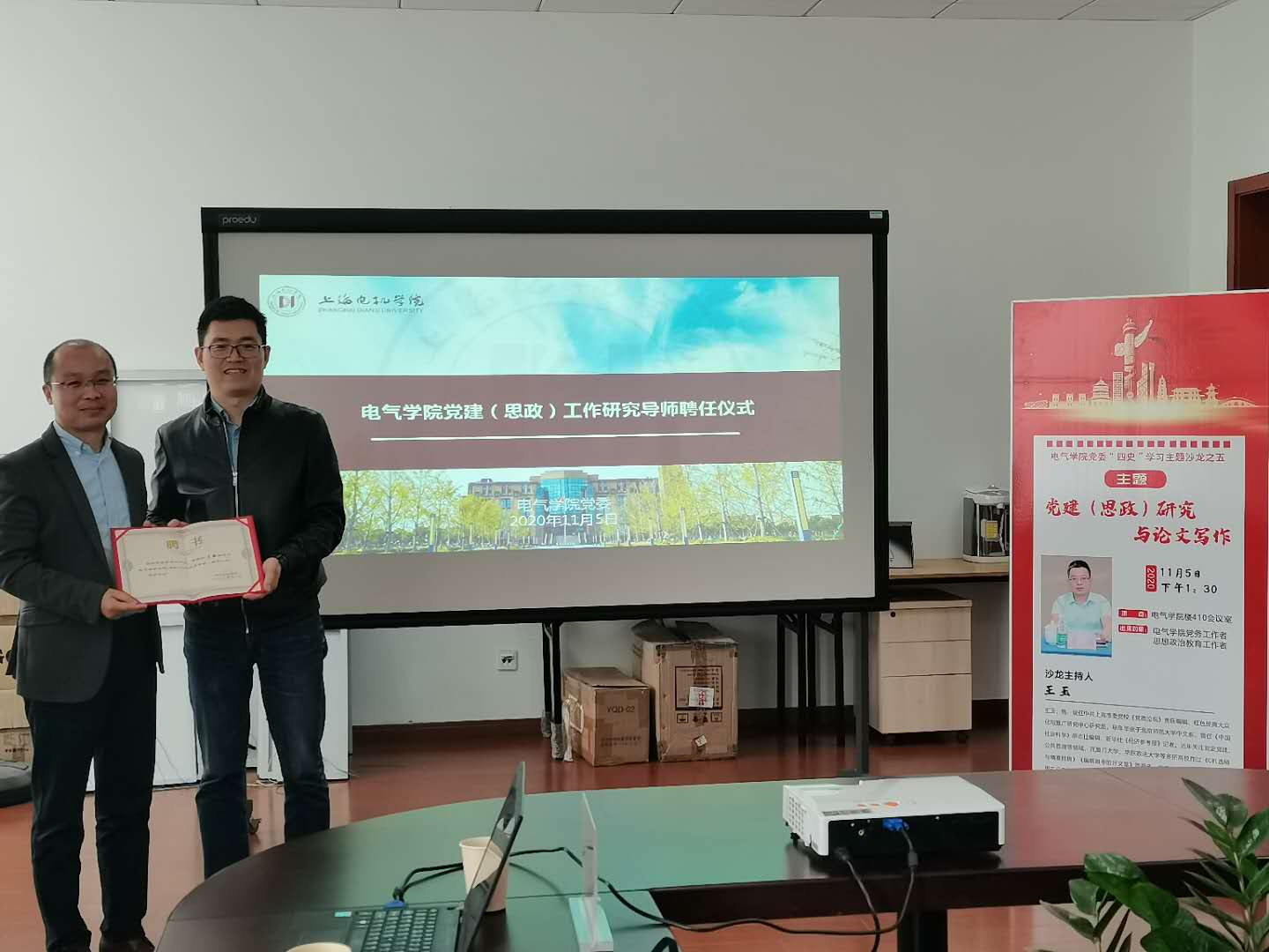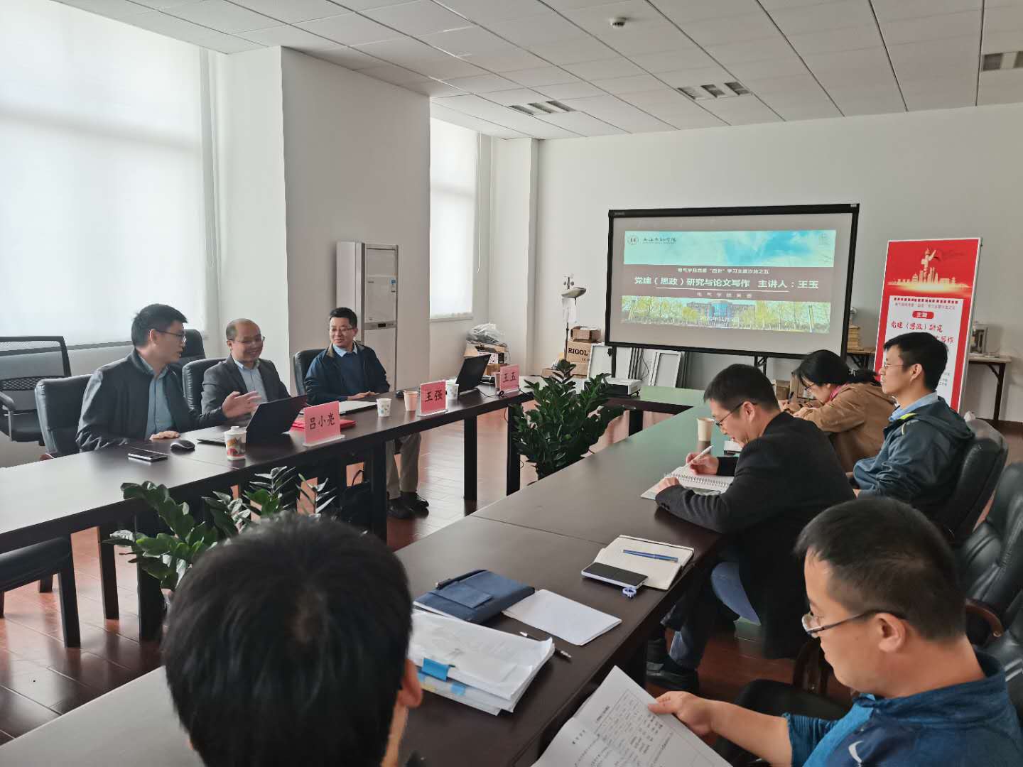 11月6日下午1点30分,电气学院“四史”学习教育系列专题沙龙之五暨党建(思政)工作研究导师聘任仪式在电气楼408举行,中共上海市委党校《党政论坛》责任编辑、红色经典大众化与推广研究中心研究员王玉围绕“党建(思政)研究与论文写作”作了专题报告。一同参加沙龙讨论的专家还有中共上海市委党校(上海行政学院)教授,哲学教研部副主任,马克思主义与实践哲学研究中心主任王强。电气学院党委委员、支部书记及来自学校职能部门及其他二级学院的党务(思政)工作者到现场聆听了本次报告。沙龙由电气学院党委书记吕小亮主持。
