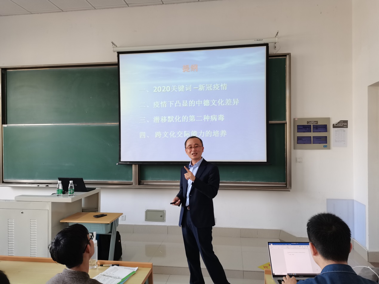 11月6日周五下午在D教102,中德学院举办了中德文化系列交流活动,邀请了上海理工大学德国文化交流中心主任周卫东教授为广大师生作了题为“疫情背景下中德跨文化交际的新思考”的讲座。