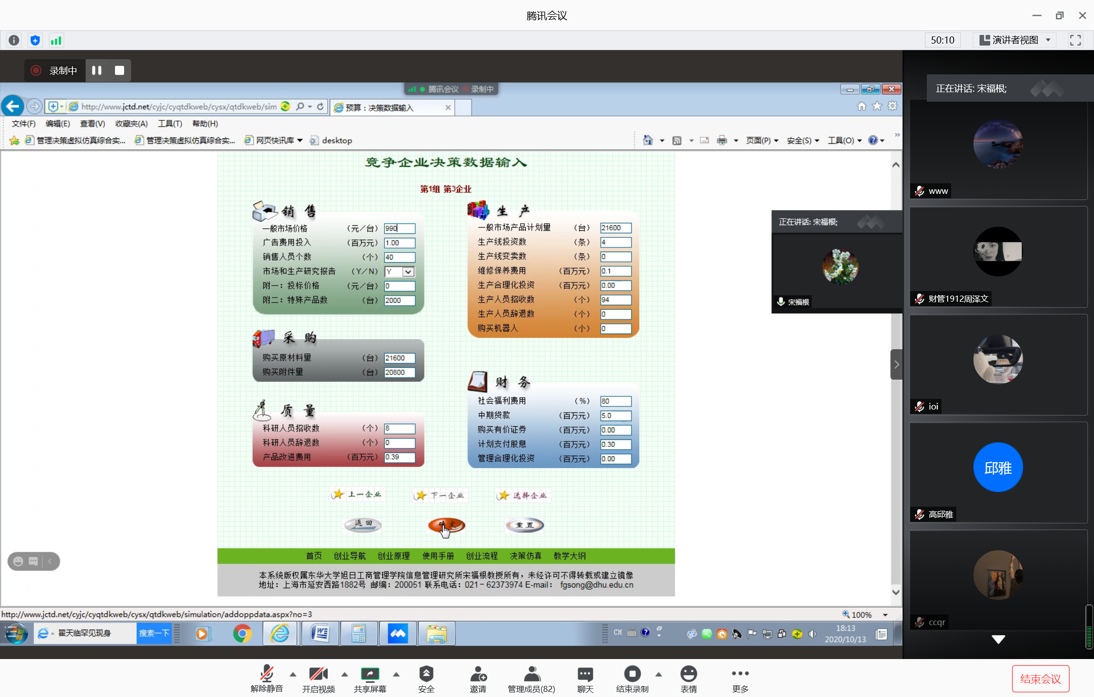 10月13日,在经过第一周期的激烈竞争后,为解答同学们在比赛中的疑问,商学院副院长熊鸿军老师特邀请东华大学旭日工商管理学院宋福根教授,为我院学生开展线上培训和答疑会。宋福根教授系统性地讲解了每个环节、周期该如何计算出合适的决策数据;分析不同决策的利弊,分析不同市场形势下企业决策该做出怎样的变化;最后对同学们提出的问题进行在线答疑。