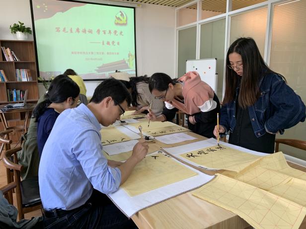 为推进党史学习教育高标准高质量开展,高职学院党总支两个学生党支部共同开展了“写主席诗词 学百年党史”主题党日活动。两个支部的全体党员参加了本次活动,高职学院党总支书记陆永贤应邀出席。