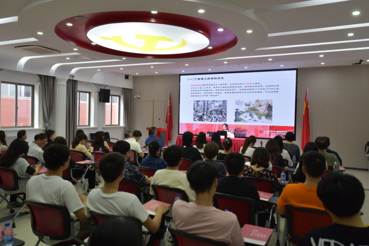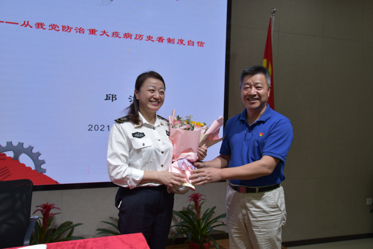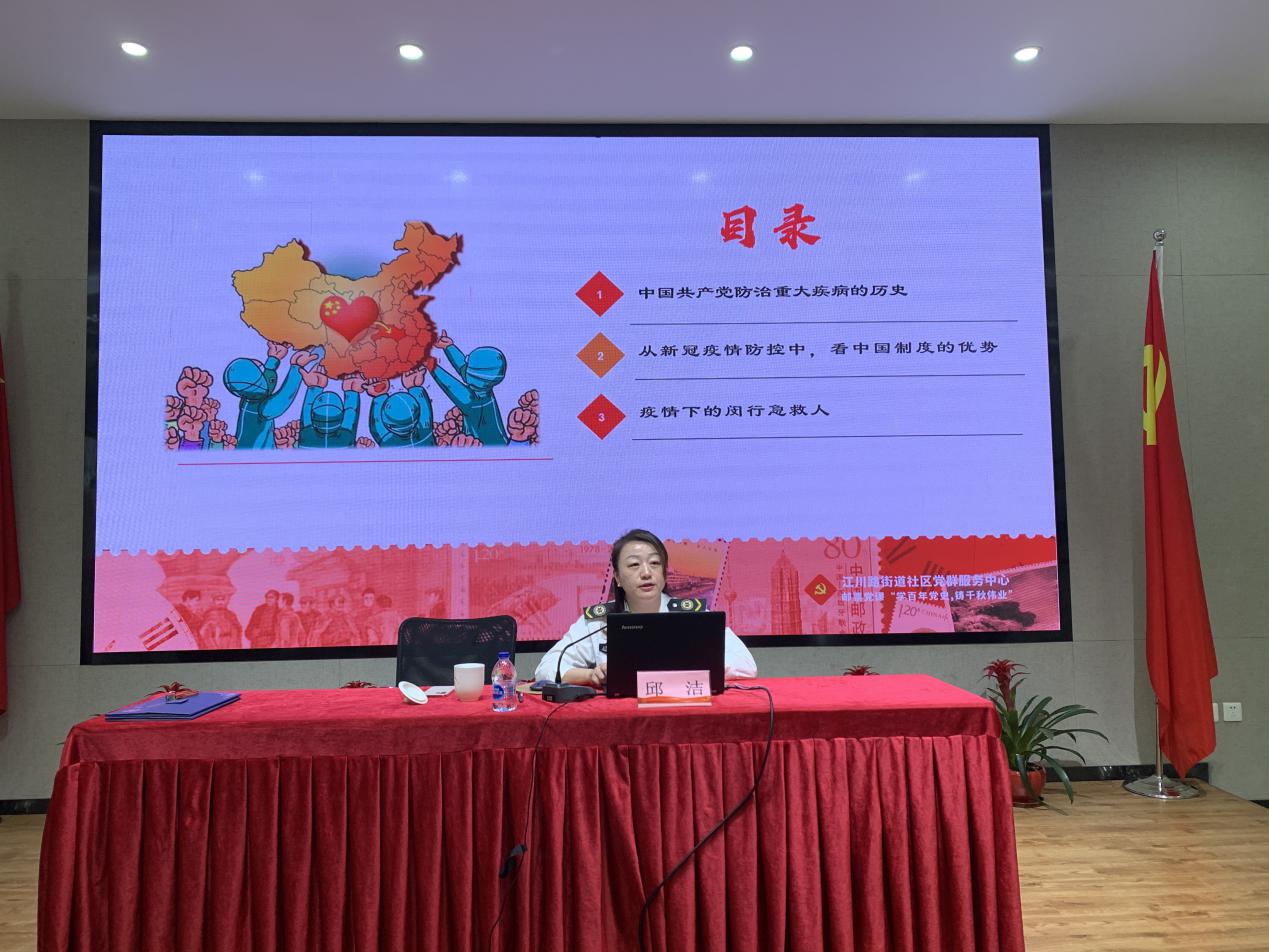 邱洁作为长期工作在一线的医务工作者,介绍了中国共产党防治重大疫病工作的历史,重点重温了那段众志成城、勠力同心、共克时艰的抗击新冠疫情岁月;讲述了广大医务工作者,如何真正做到以群众身体健康为己任,以战士的姿态战斗在抗疫一线。历史事实证明只有中国的社会主义制度,才能够集中力量办大事,才能够在面对重大危机时候有强有力的治理能力。讲座内容丰富,氛围浓厚,在场党员深刻感受到了在抗击新冠肺炎疫情中全社会特别是一线医护工作者们用实际行动践行着“生命至上、举国同心、舍生忘死、尊重科学、命运与共的伟大抗疫精神”,接受了精神洗礼。