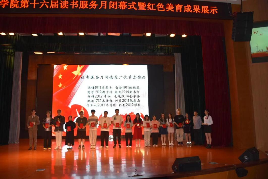 会议表彰了“读红色经典·讲红色故事”主题征文、“读红色经典·讲红色故事”“最红阅读人”评选、“百年留声·致敬经典”诵读赛、读书服务月阅读推广优秀组织者、优秀志愿者评选、模拟馆员技能体验查找图书比赛等6个项目的荣誉和奖项。会上还进行了红色美育成果展示活动,机械学院、外国语学院、月河诗社、春雪剧社、国风社同学们带来了红舞表演《不忘初心》、红诗朗诵《祖国啊,我亲爱的祖国》、红色歌舞节目《时代芳华》、红色朗诵剧《真理的味道》等,共同献礼建党100周年。