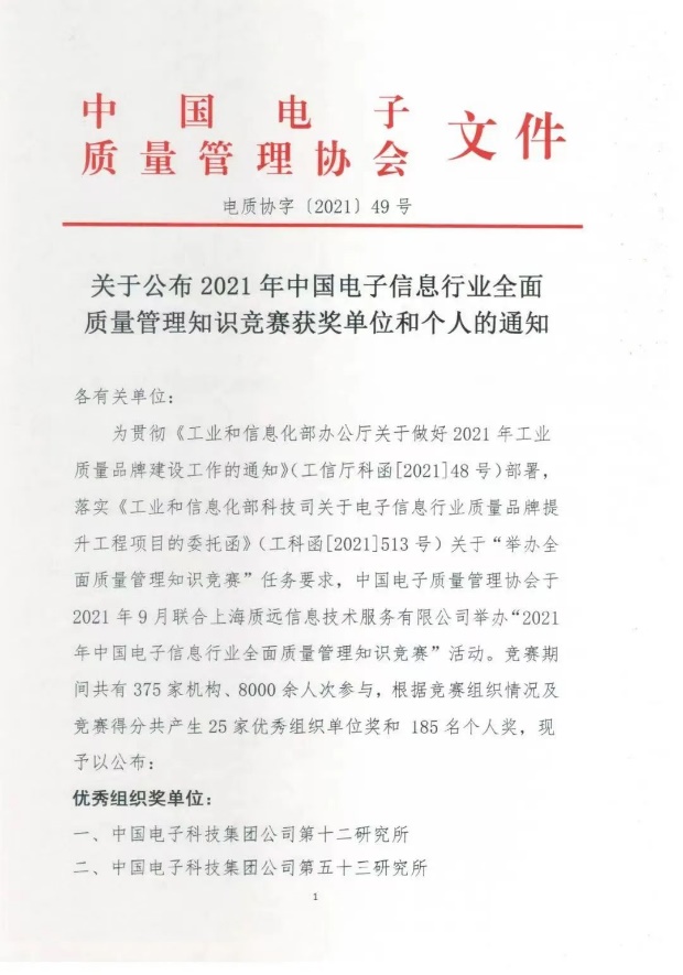 近日,中国电子质量管理协会发布《关于公布2021年中国电子信息行业全面质量管理知识竞赛获奖单位和个人的通知》(电质协字〔2021〕49号),我校获优秀组织奖。