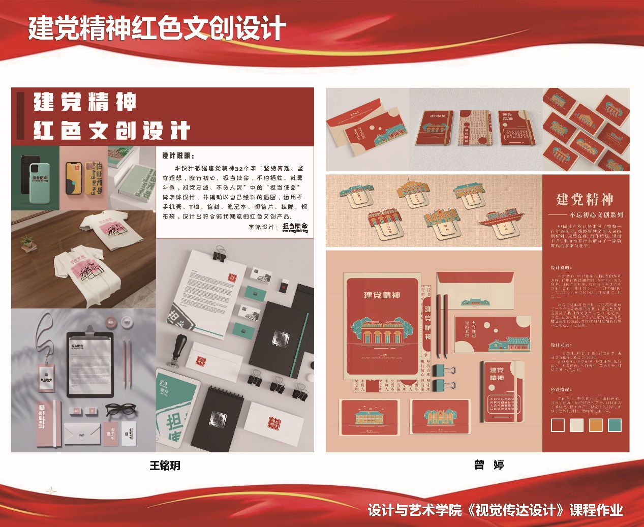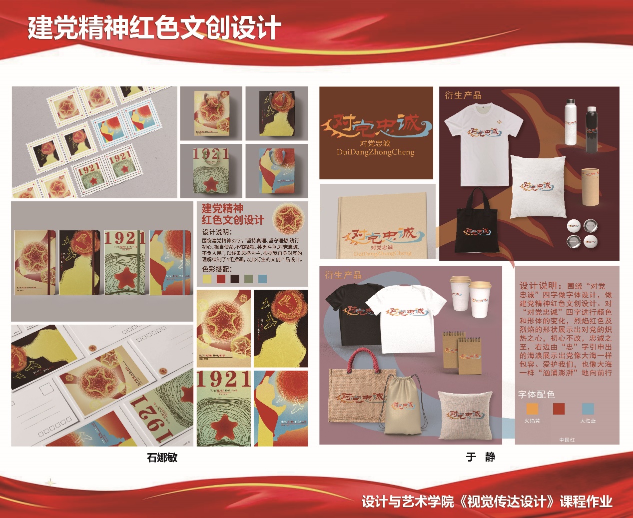 主题文创设计展紧紧围绕党在伟大革命过程中形成并不断弘扬的“坚持真理、坚守理想,践行初心、担当使命,不怕牺牲、英勇斗争,对党忠诚、不负人民”的伟大建党精神,引导学生从党史学习教育中汲取智慧与力量,通过明信片、邮票、书签、T恤、记事本、手提袋等的设计,将中国共产党从小到大、由弱到强的百年奋斗征程,用视觉设计的语言融汇到文创产品设计中,有效激发了新时代大学生的使命感、责任感。