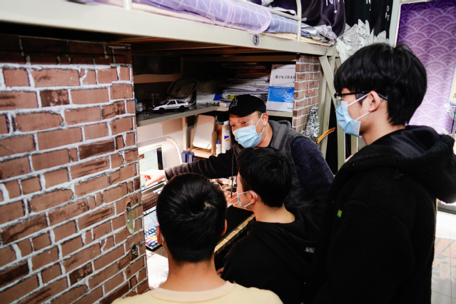 近日,学校因疫情防控原因实施了校园准封闭管理,线下授课也改为线上教学。电气学院的辅导员老师岳宁在走访寝室中了解到,有同学对《机械工程基础》这门课的部分知识点掌握得不够透彻,他随即与任课教师卞一明取得了联系,作为学校疫情防控工作专班成员的卞老师正好在校,便决定利用工作之余的晚上时间专门去一趟学生宿舍,在线下跟同学们做进一步的交流讲解。