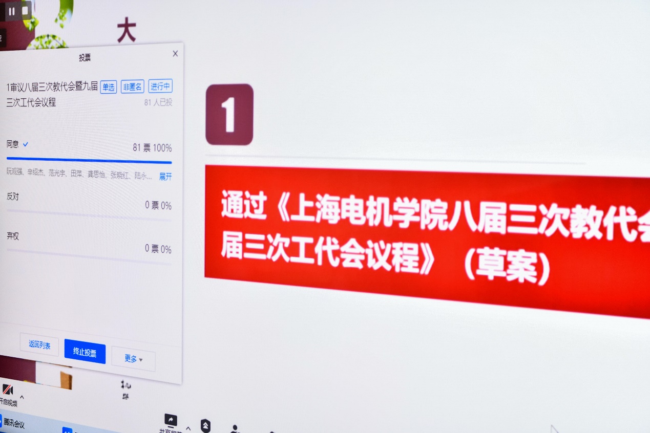 全体参会代表在各分代表团审议会上积极发言,就推进学校高质量发展、加强人才队伍建设、强化办学条件保障、厚植办学特色等事关学校改革发展的重大问题和涉及师生切身利益的具体问题,提出了许多建设性的意见和建议。在3月29日召开的第二次全体代表会议上,全体参会代表认真听取了《大会报告修改说明》,表决通过了《上海电机学院八届三次教代会决议》和《上海电机学院九届三次工代会决议》。