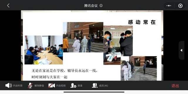 居健、王博作为大四学生代表和志愿者代表分别做了分享,赵璞、杜浩明、程明杰、周子朝等辅导员老师从学习、生活、心理等各方面提出了要求和建议,强调线上学习不能松、思政教育不断线,鼓励大家积极开展各项主题活动,充分展现青年学生抗疫必胜的决心,大力传播正能量。