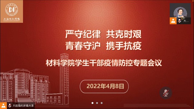 4月8日,为进一步压紧压实工作责任,筑牢疫情防控防线,材料学院召开了线上学生干部疫情防控专题会议。学院直属党支部副书记、副院长张静,全体辅导员,全体学生干部参加会议。