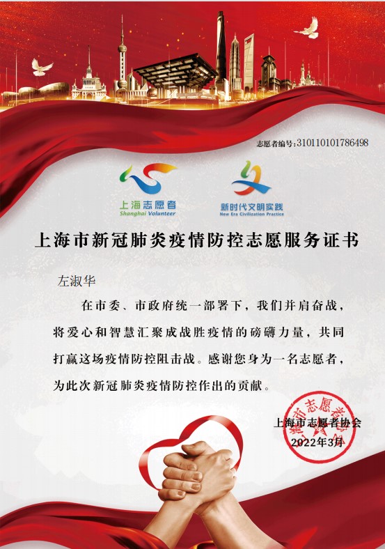 本学期左淑华老师还承担了《英语词汇学》和《英语语法》的教学任务,在完成线上教学任务后,她积极践行党员“双报到”要求并投身社区志愿者服务,于近日收到《志愿者服务电子证书》,用言传身教书写了人民教师和共产党员应有的形象。(供稿:外国语学院)