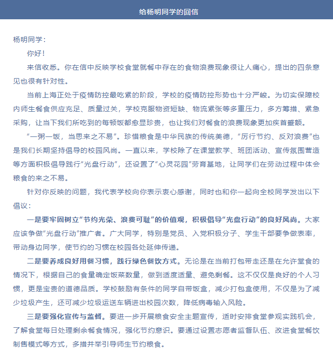1. 校长回信,鼓励学生担当疫情防控的“主角”。针对校园准封闭管理中出现的食物浪费现象,电气学院研究生向校长龚思怡呈递了一封电子信函,提出了节约粮食的意见建议。龚校长在回信中表示,针对学生信中提及的食物浪费现象及改进建议,校领导高度重视并认可,由衷感谢该学生对校内堂食改进的意见和建议,深入鼓舞的学生正在积极行动,努力将改进措施落实到科创项目的发掘中。
