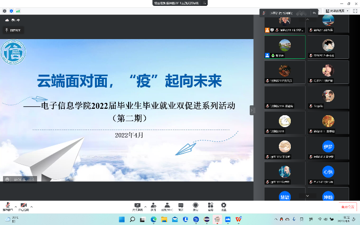 3. 云端会面,共同奔赴未来。电子信息学院举办第二期“云端面对面,‘疫’起向未来”活动,一百余名毕业生齐聚云端。正勤电子有限公司总经理进行空中直播带岗,并为毕业生们提供生涯规划与职业发展方面的宝贵经验;物联网1811班的朱富强同学分享参军入伍经历以及成功通过退伍士兵专项计划考取华东师范大学的经验,呼吁毕业生同学们抓住机会踊跃征兵入伍。