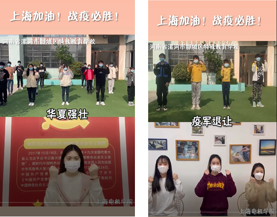 6. 隔空祝福,共筑抗疫信心。高职学院收到了来自河南省漯河市郾城区特殊教育学校的加油祝福视频。自2016年以来,高职学院志愿者团队每年暑假都前往特殊学校支教。虽然2020年和2021年由于疫情支教暂停,但距离并未阻隔两地学生的爱,特殊学校的同学们通过演绎手势舞的方式在云端为上海电机学院加油、为上海加油。