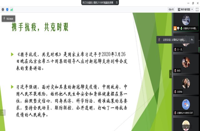 学院各班级围绕疫情防控主题,纷纷召开线上班会,讲述当前疫情形势、学校管理规定、居家防疫妙招等,就疫情期间如何保持身体与心灵健康进行广泛的交流和探讨。
