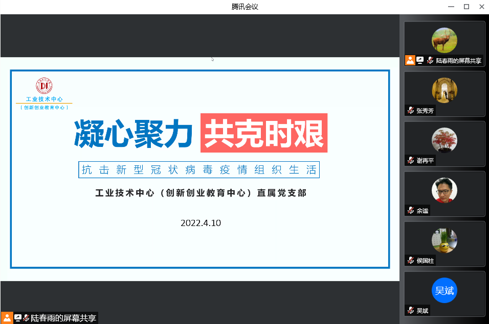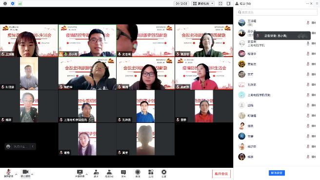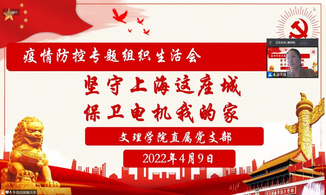 文理学院直属党支部利用腾讯会议召开“坚守上海这座城,保卫电机我的家”疫情防控专题组织生活会。直属党支部书记康秀珠号召疫情防控期间校外党员同志要主动下沉社区;学院专班教师要提高战斗意识,确保工作正常运行;校内专班党员教师继续参与学生园区网格化管理。她还对有特殊情况的党员教师表示了关心和问候。会上大家也纷纷敞开心扉,就“守护电机我的家”进行了交流。