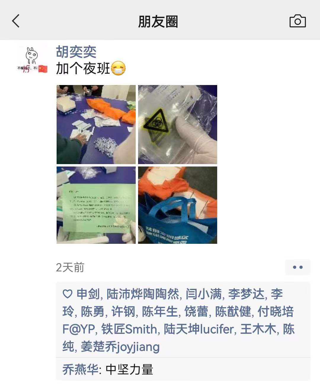 作为社区志愿者的胡奕奕老师,在疫情防控志愿服务中肩负着主力任务,她积极参与小区的核酸检测志愿服务,负责维持核酸检测秩序及清点人数,同时还作为楼组长组织楼栋成员进行每天的抗原检测任务并完成收集与统计等服务工作。一天深夜,接到了社区志愿者微信工作群发出的紧急通知,需要连夜完成抗原检测试剂盒的整理分装,她又迅速加入队伍,一直忙到次日凌晨,为保证完成检测盒的分装任务赶出了“加速度”。第二天清晨,她又马不停蹄地逐户分发抗原检测试剂,已经连续工作多个小时她再次进入了忙碌的工作状态……