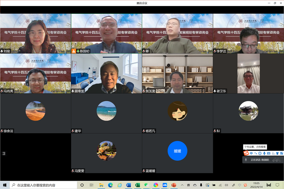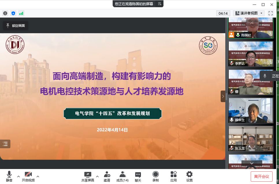 4月15日晚7点,电气学院“十四五”改革与发展规划专家咨询会通过线上腾讯会议召开。会议邀请学校党委副书记杨若凡,华东理工大学教授顾幸生,原上海电气电站集团副总裁/上海电气燃气轮机总经理、现上海电气电站装备高级顾问袁建华,Lenze伦茨集团亚洲总裁谢卫东,上海第二工业大学副校长徐余法,上海电机学院原副校长焦斌,上海电气自动化集团副总裁张玉龙等高校学者、企业专家等出席。