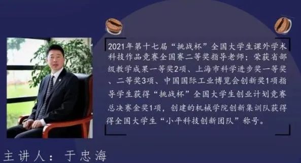于忠海教授向同学们讲述了他十几年来坚持不断探索并实践机械类学生创新能力培养的方法和路径,从2011年指导《基于人机工程的新型爬行锻炼机》获第十二届“挑战杯”全国大学生课外学术科技作品竞赛三等奖,到2012年指导的《上海卓越磁力吸屑辅具有限公司》获第八届“挑战杯”中国大学生创业计划竞赛金奖,从2015年指导的科创团队被授予“小平科技创新团队”,到2021年指导的《基于Caffe的咖啡瑕疵豆检测筛选应用系统的设计与实现》获第十七届“挑战杯”全国大学生课外学术科技作品竞赛全国赛二等奖,如数家珍般介绍和评点了每个团队的负责学生和他们如今的发展,送上了一堂过去与未来交织、想法与实践交会的科创视听盛宴。