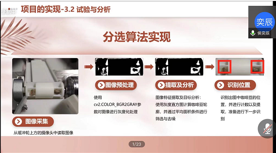 《基于Caffe的咖啡瑕疵豆检测筛选应用系统的设计与实现》团队的负责人侯奕辰,从初期的想法、探索、选题、实践、再到一路比赛过关斩将的心路历程,向参与活动的同学们进行了线上的交流分享。