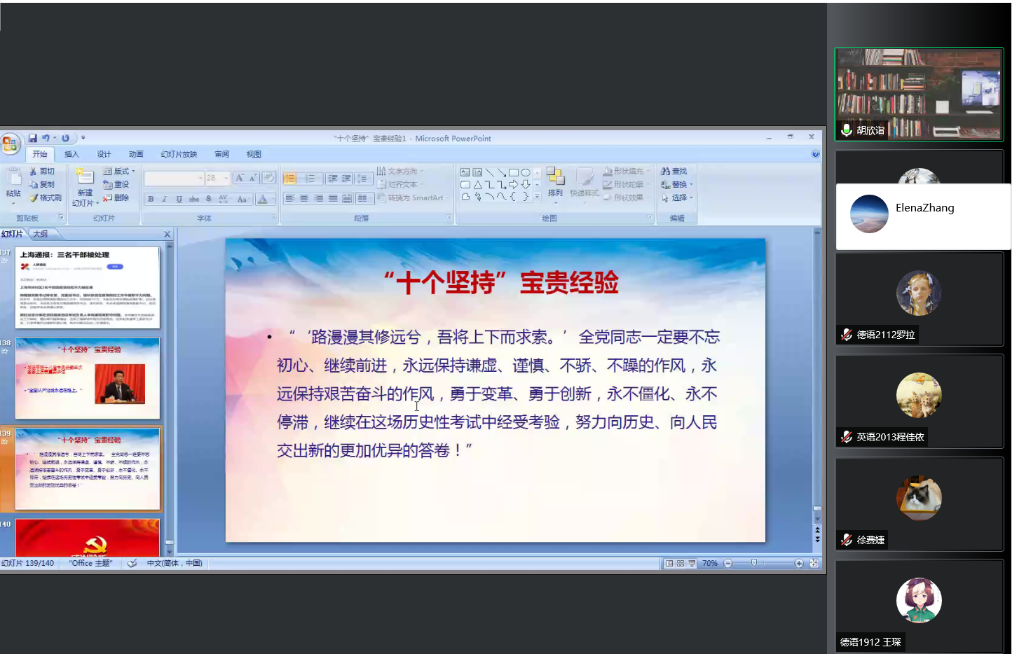 为了使师生更好地理解“十个坚持”宝贵经验的历史意义,在疫情防控中不断传播正能量,4月22日下午,外国语学院党总支开展了“思政大课堂”,主题为“‘十个坚持’宝贵经验的历史逻辑和当代实践”。此次大课堂由学院思政导师、马克思主义学院胡欣诣老师讲授,370余名学院师生代表参加。