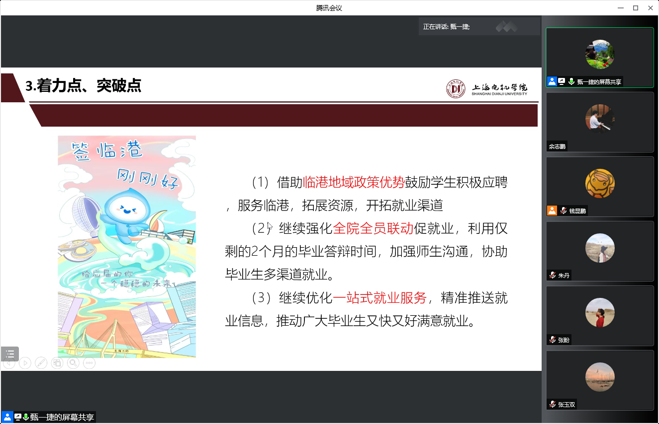 最后,外国语学院院长张玉双强调,一是深刻领悟部署就业“一把手工程”,全面落实全院全员责任制。学生满意就业是对人才培养效果的检验,促进毕业生又快又好满意就业是外国语学院全体教职工每个人的责任。二是充分开辟就业渠道,拓展就业资源,发挥临港新片区区域优势,推进就业工作。三是切实抓好五六月份重要攻坚期,全体教职工要根据分级分类台账,落实到位,指导、帮助学生实现就业。(供稿:外国语学院)