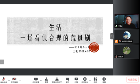 2. 空中讲坛有序推进。商学院主办的“诺贝尔文学奖经典作品研读——加缪《局外人》”专题讲座暨“空中讲坛——抗疫心连心,师生零距离”系列活动(第三十一期)于腾讯会议平台成功举办,上海交通大学人文学院研究生会主席王帆主讲,460余位青年师生积极参与。