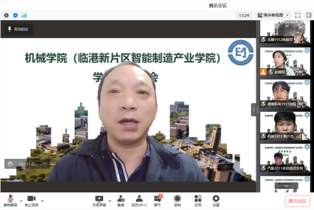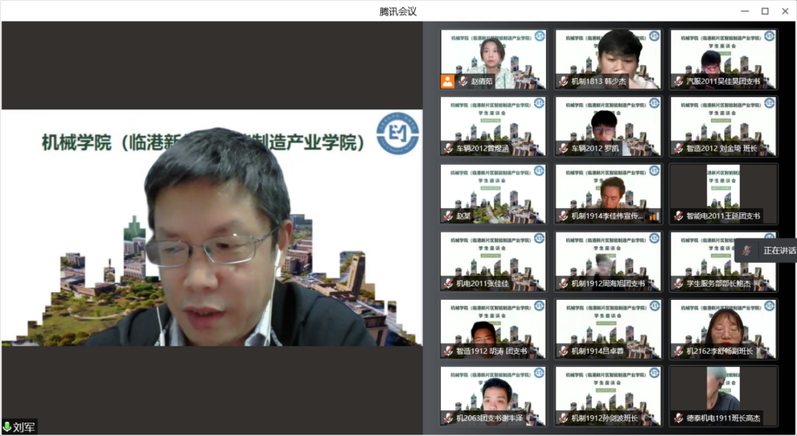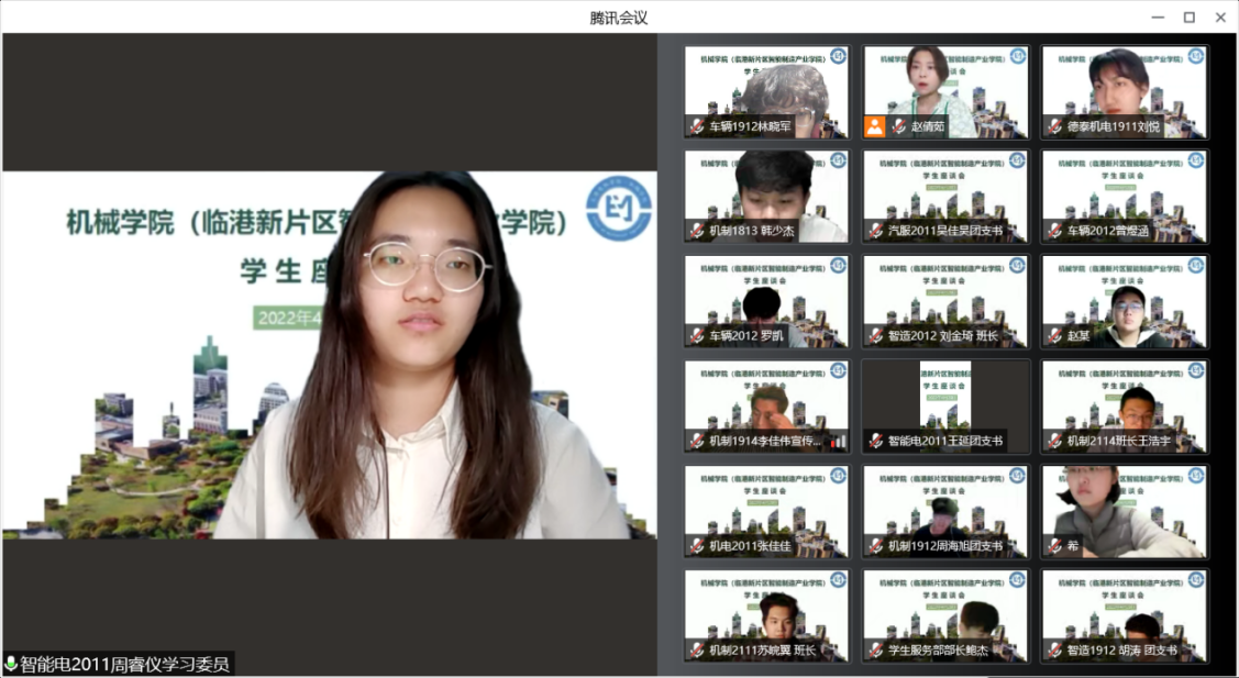 4月29日晚7:30,机械学院(临港新片区智能制造产业学院)组织召开学生座谈会,院长刘军、党总支书记卞一明、副院长张栋、副院长赵爽、全体辅导员及班主任和学生代表参加会议,党总支副书记刘国军主持会议。