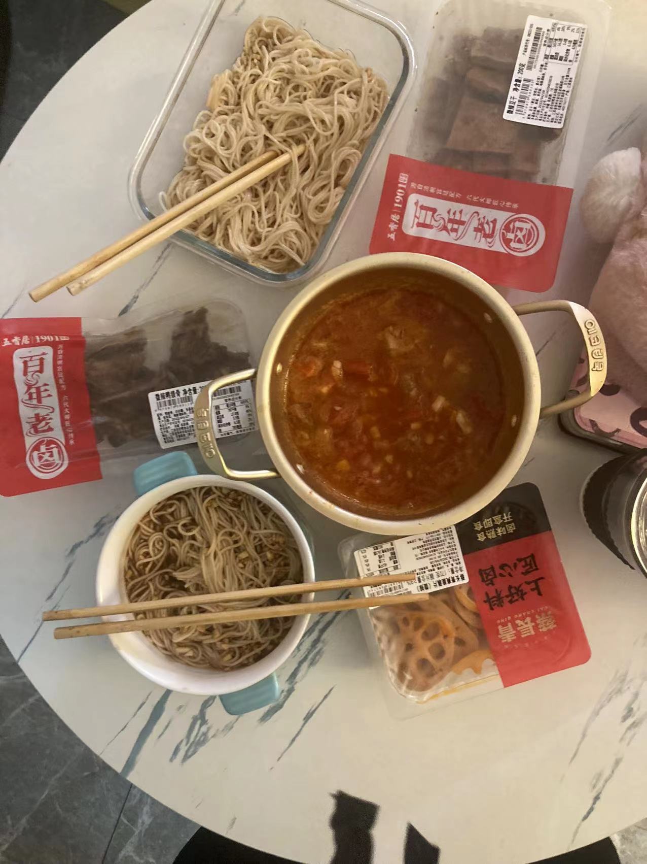 今天是五一劳动节,我决定为爸妈做一顿饭,由于疫情当下物资缺乏,在综合了家里的物资后,我打算做一道番茄牛腩面和一道凉拌面。说干就干,首先是凉拌酱料的调制,蒜是必须要的,再加点酱油、醋、糖、蚝油,一份美味的凉拌料就出来啦;然后是水开下面,煮好后将面用凉水冲冷,再浇上酱汁,一道凉面就好啦。接着是番茄牛腩,因为是昨天晚上做的,今天就是拿出来加热一下,然后浇在面上,一道番茄牛腩面就出炉啦。最后加几份熟食,一顿美味的午餐就大功告成啦!