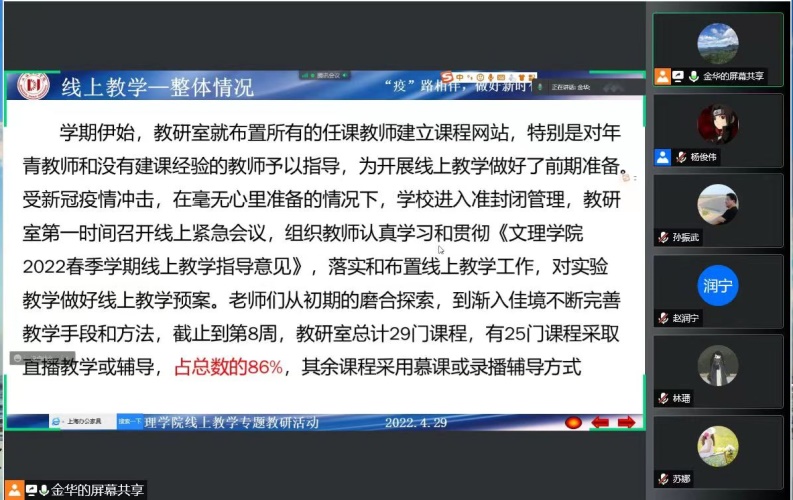为深入学习贯彻习近平总书记重要讲话精神,并结合当前疫情期间线上教学工作,文理学院于近日举行了2场以“‘疫’路相伴,做好新时代大先生”为主题的专题教研活动,各教研室互相观摩、老中青教师共同交流、数理及人文课程互动研讨,老师们纷纷表示要进一步提高教书育人能力,争做具有高尚道德情操和扎实教学功底的新时代大先生。