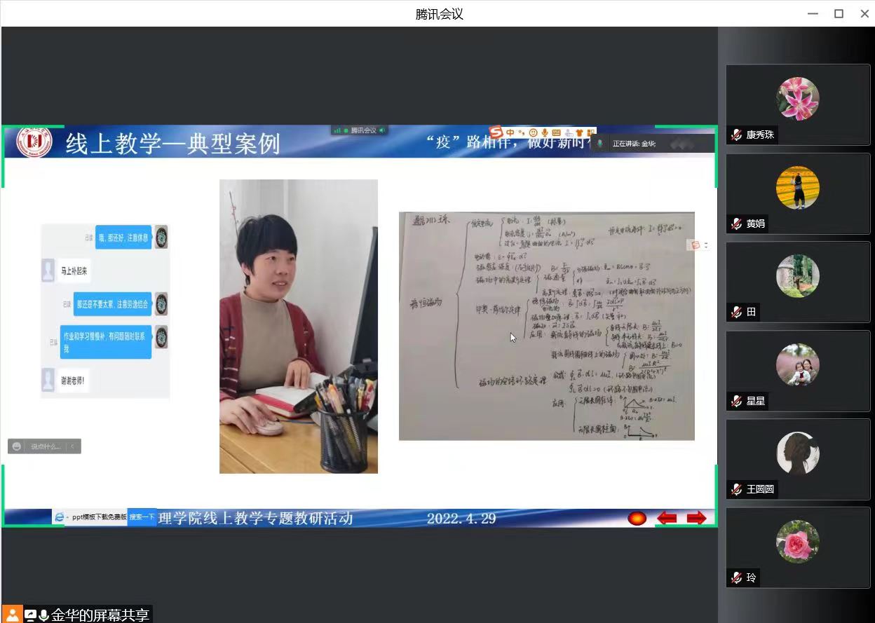 教务处付晓培老师观摩了教研活动。她从新一轮审核评估要求的角度,针对数理基础课及通识课教学质量提升、线上教学模式创新等问题与老师们进行了交流研讨。