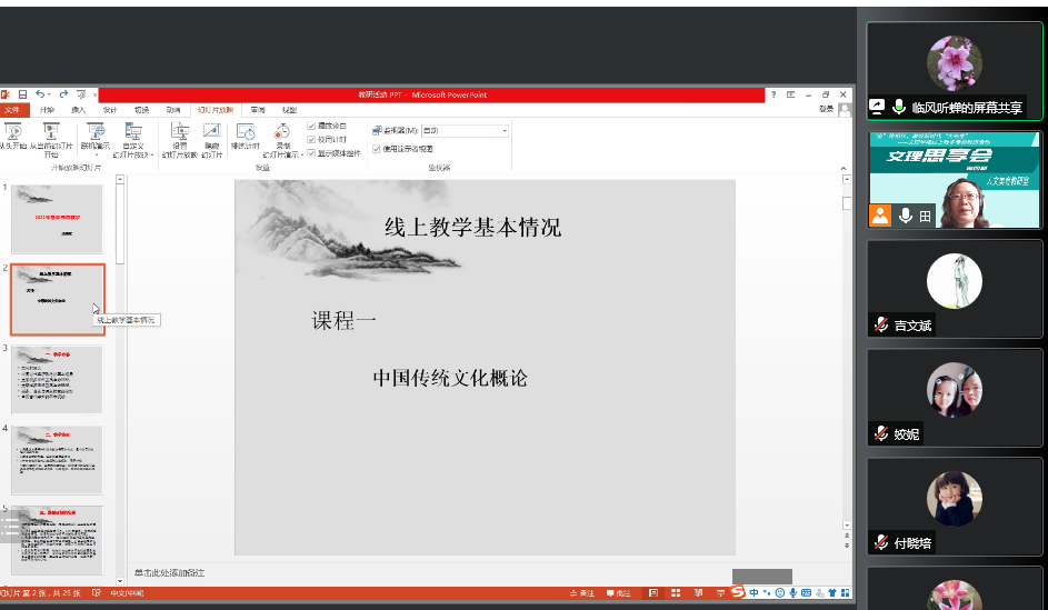 物理教研室孙振武教授向青年教师分享了他的在线共享课《科学技术与人类文明》的建设经验,并从教学运行机制的角度对线上教学模式及其质量提升进行了深入探讨,让青年教师获益良多。人文美育教研室苏李副教授就疫情期间“在线播放+云欣赏”的美育课程线上实践教学探索、段继红教授就留学生文化素养课如何讲好中国抗疫故事等进行了分享。青年教师梁盼、沐云逸等就自身线上教学及课程思政教改实践等做了交流,并表示要多向老教师学习,不断提升教书育人水平。