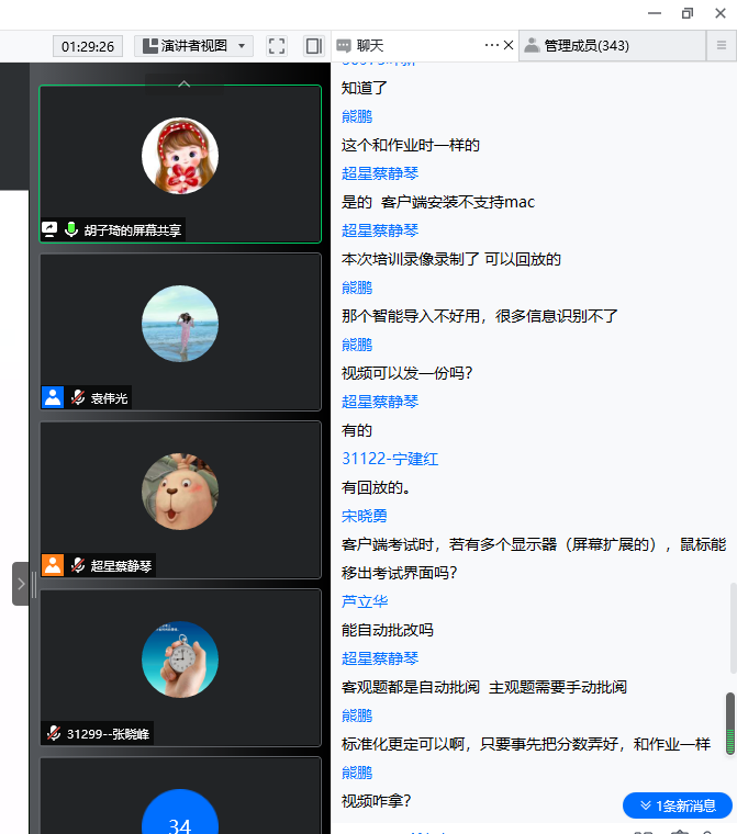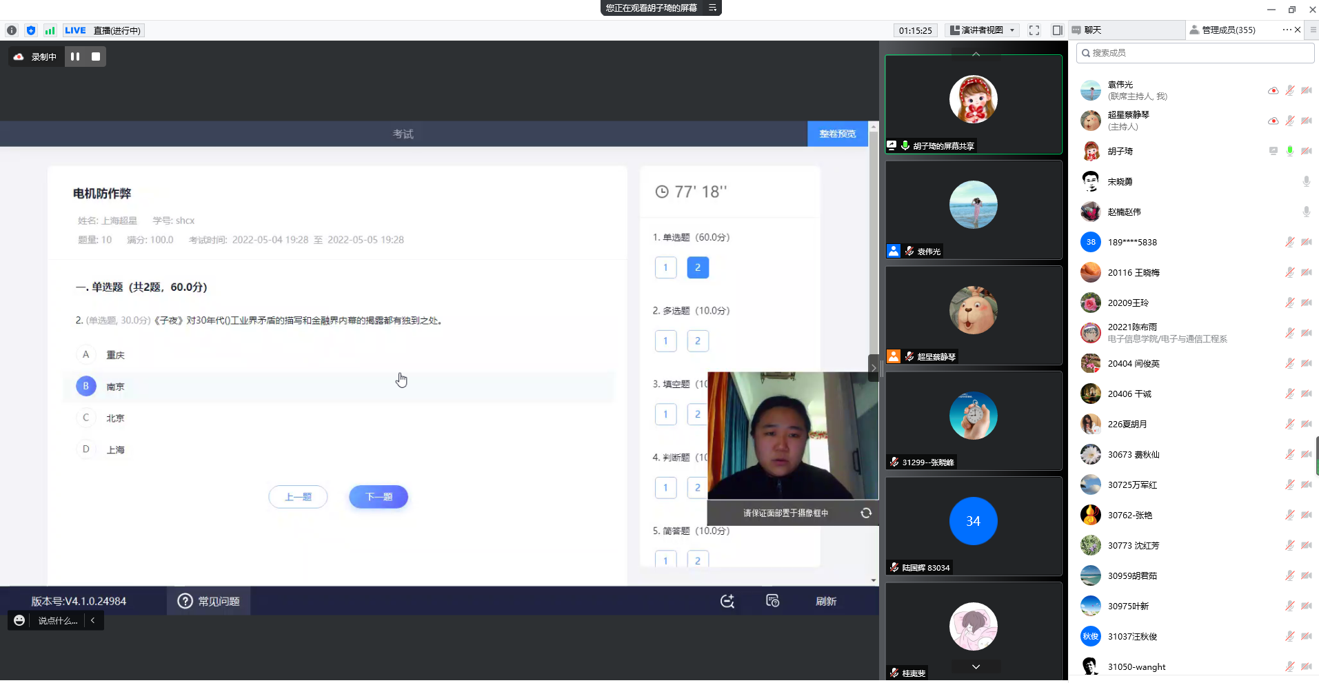 5月4日晚19:00-20:30,教务处组织了第一场线上考试培训会“超星平台考试模块使用线上培训会”。本次培训会有来自机械学院、电气学院、材料学院、电子信息学院、商学院、设计与艺术学院、外国语学院等各部门各二级教学单位的参会教师355人。
