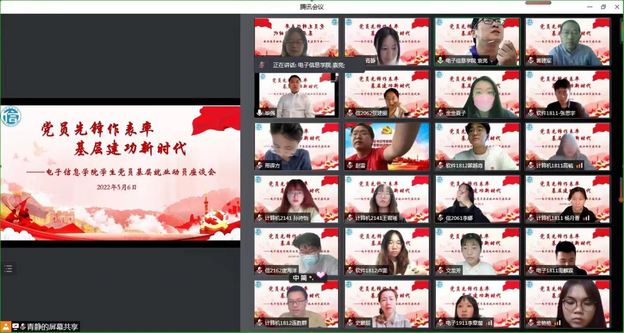 5月6日16:00,电子信息学院在云端召开了学生党员基层就业动员座谈会,学院党政领导、支部书记、就业辅导员、全体学生党员等80余人齐聚云端参会。座谈会由党总支副书记、副院长袁亮主持。