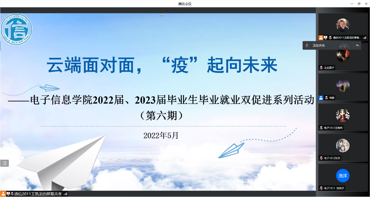 座谈会之外,电子信息学院2022届、2023届毕业生毕业就业双促进系列活动也在火热进行中。5月6日,学院“云端面对面,‘疫’起向未来”毕业生毕业就业双促进系列活动来到了第六期,学院学工办主任张书娟老师向莅临云会议讲解直播的企业领导和专业教师表示真挚的感谢,向信任与共支持本次活动的辅导员、班主任和毕业生们送上美好的祝愿。