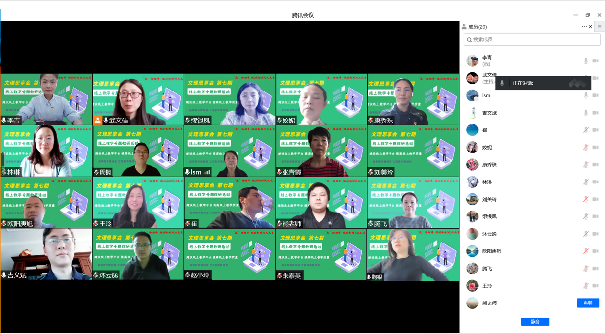 为切实提高数学基础课程教学质量,5月6日下午,文理学院高等数学教研室和工程数学教研室共同举办“加快教学平台建设,提升课堂教学质量”的线上专题教研活动。文理学院院长朱泰英、直属党支部书记康秀珠、副院长吉文斌以及全体数学教师参加。