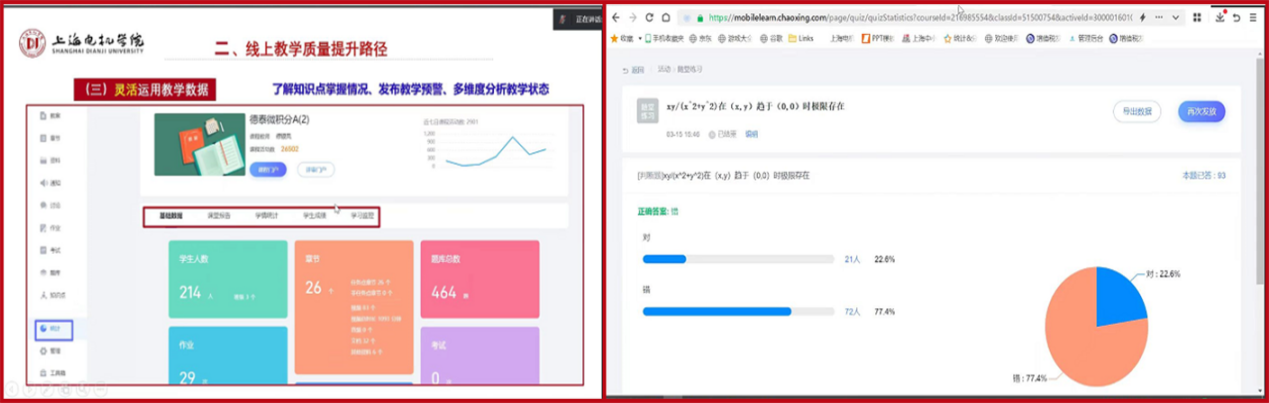 高等数学教研室周钢老师自2020年开始一直致力于线上教学平台的建设,并在课堂教学中予以实践。他在活动中向大家分享了近两年在超星学习通平台上进行线上作业的经验、学生成绩提升情况以及学生对线上作业的接受程度。针对电脑网页或者手机APP难以输入数学符号这一难点,周老师现场向大家演示在超星学习通平台如何通过word模板导入和题目框手动输入不同题型的数学题目,并介绍了作业发布、批改中的一些细节事项。