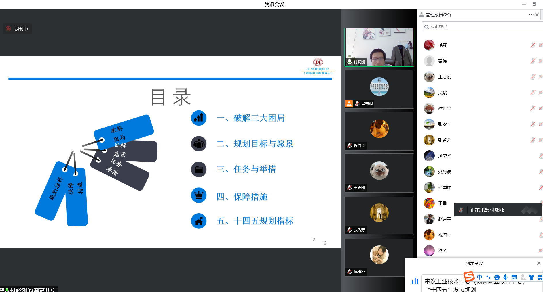 全体参会教职工认真听取、审议中心“十四五”发展规划,就推进中心改革发展提出了建设性的意见和建议,在疫情防控管控条件下充分利用新技术新方法,采取网络投票的方式对工业技术中心(创新创业教育中心)“十四五”发展规划进行了表决,获得一致通过。