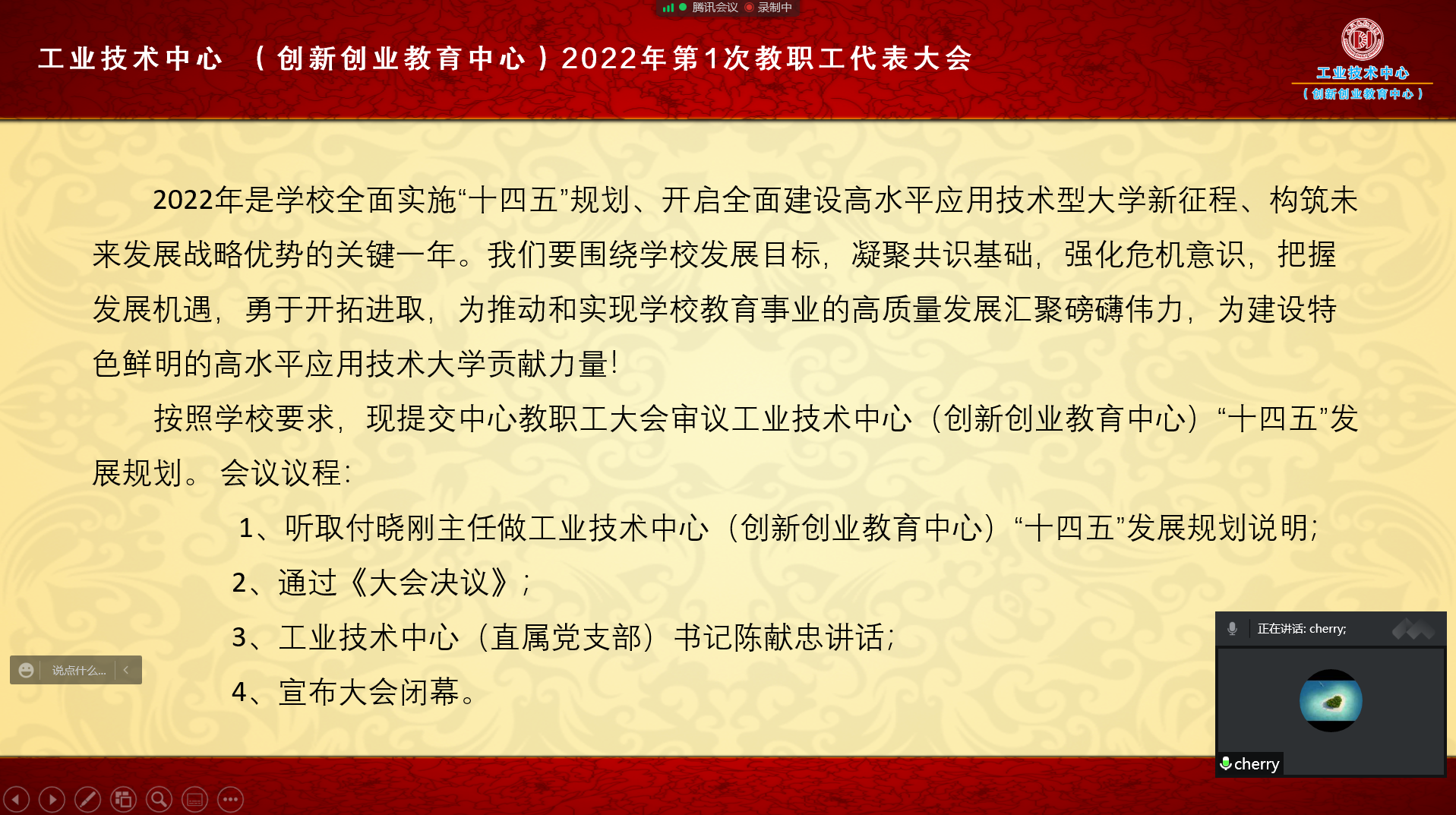 2022年是学校深入推进实施“十四五”规划、开启全面建设高水平应用技术型大学新征程、构筑未来发展战略优势的关键一年。为适应新形势和新要求,工业技术中心(创新创业教育中心)于5月11日下午在腾讯会议平台召开2022年第1次教职工代表大会,中心31位教职工全体参会。