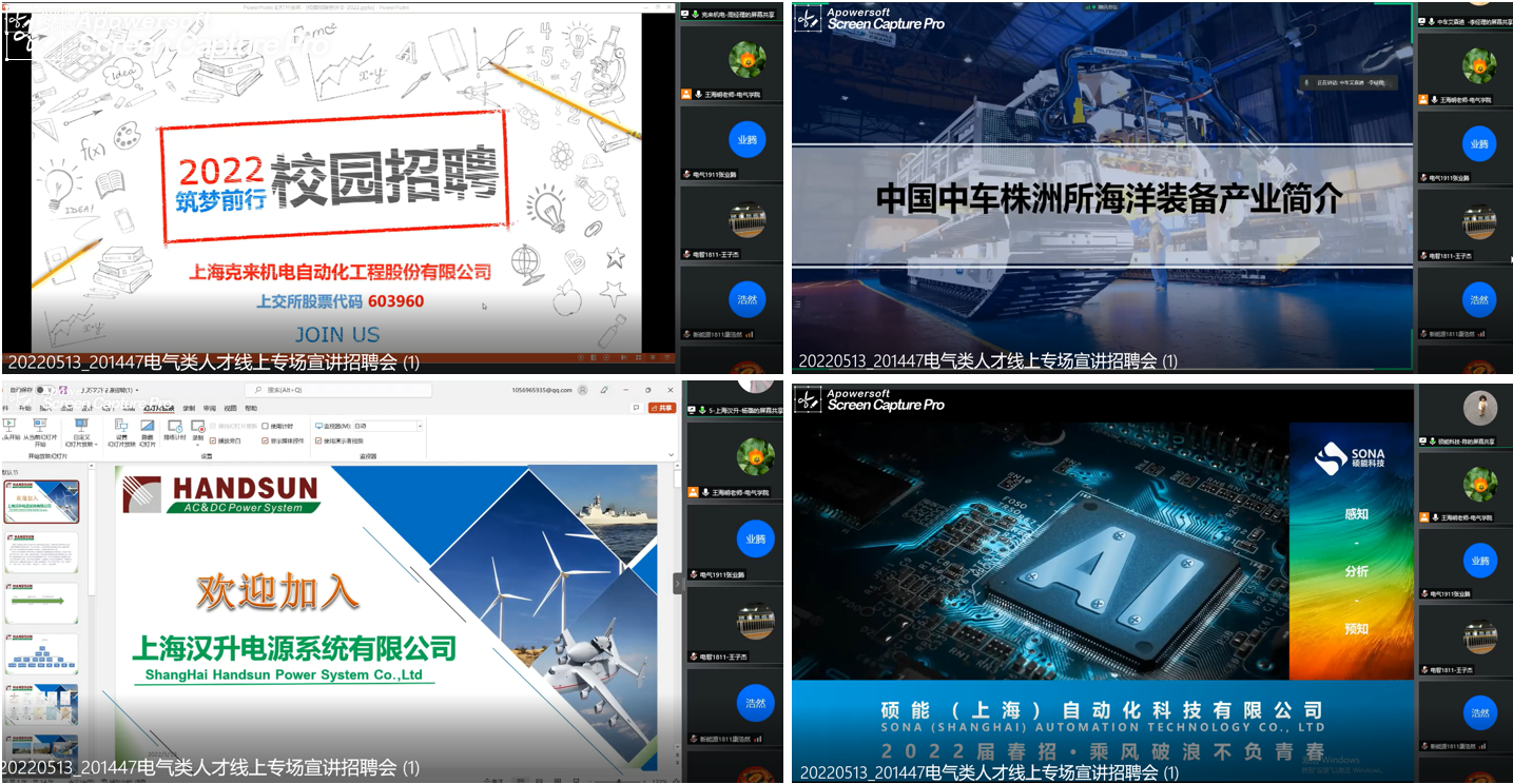 为积极应对新冠肺炎疫情带来的影响,抢抓毕业生求职关键期,帮助毕业生顺利就业,落实教育部2022届高校毕业生就业促进周活动要求,电气学院于5月13日联合28家对口名企搭建线上平台,组织开展了电气类人才线上专场宣讲招聘会。企业负责人,电气学院领导、辅导员班主任和来自我校电气类、仪器类、自动化类、机械类、电子信息类、材料类等相关专业学生400余人参会。