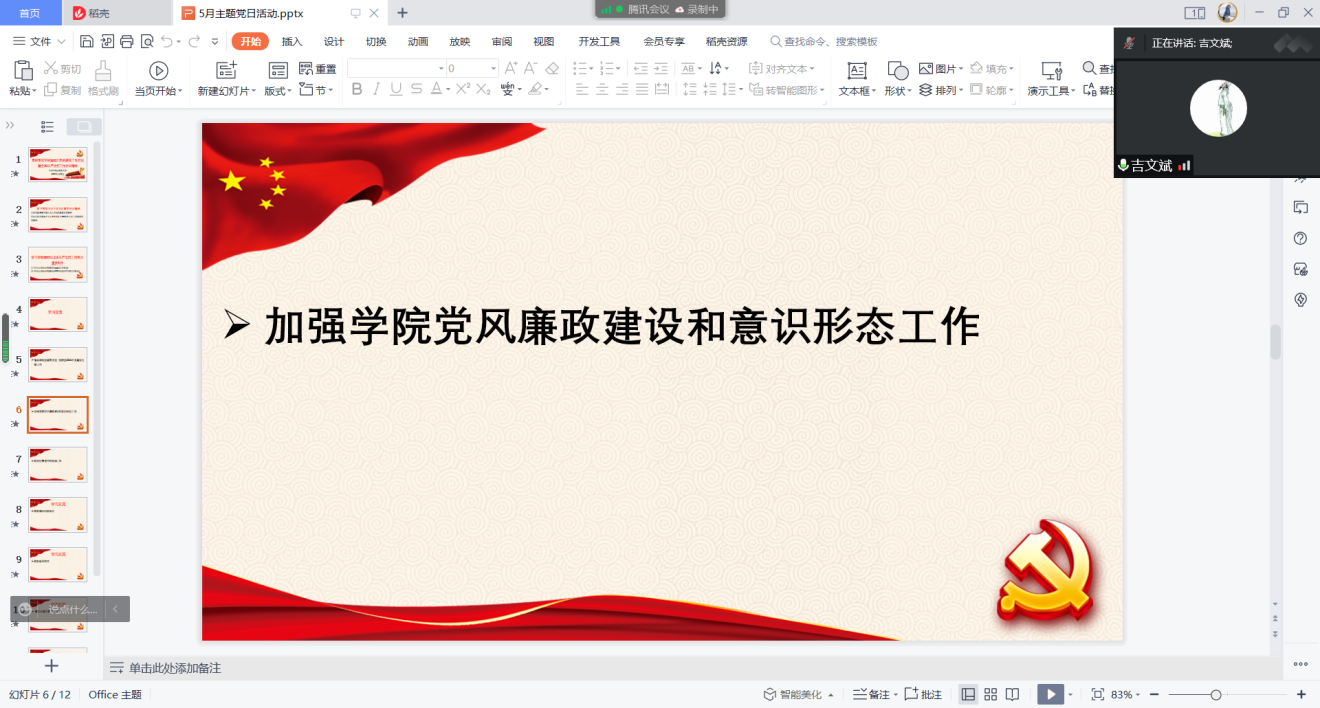 为进一步落实全面从严治党,加强学院党风廉政建设及意识形态工作,副院长吉文斌带领党员老师认真学习习近平总书记关于维护意识形态安全的重要论述精神,充分解读不同时代背景下意识形态的深刻内涵及新时代高校意识形态工作的逻辑遵循,呼吁每位党员老师以立德树人为根本任务,加强课堂、教材、校园文化、网络等高校意识形态阵地管理意识,并从如何做好课堂教育教学管理、教材建设、课程思政、师德师风、网络舆情等方面,对在新时期新形势下如何加强学院党风廉政建设和意识形态阵地管理工作,提出了具体的工作思路和要求。