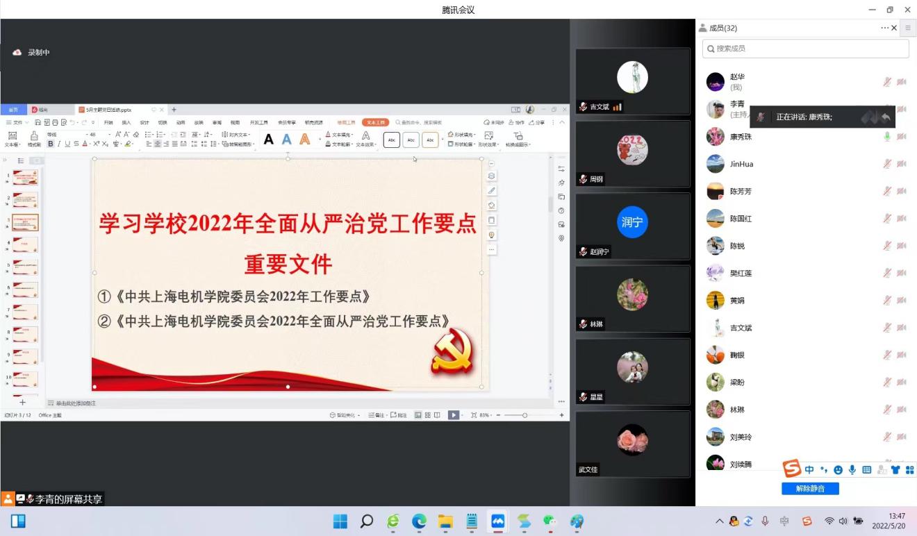 之后,康秀珠传达了学校2022年党的建设工作会议暨全面从严治党工作会议精神,带领大家学习了《中共上海电机学院委员会2022年工作要点》《中共上海电机学院委员会2022年全面从严治党工作要点》等文件要点,并结合实际就如何落实学校党委要求进一步推进2022年直属党支部工作进行了发言,动员广大党员同志进一步统一思想、凝聚共识、以更加饱满的热情,更加昂扬的斗志,更加务实的作风,从严从紧推进疫情防控攻坚行动,坚决打赢疫情防控攻坚战,全力推动学校各项决策部署落地落实。